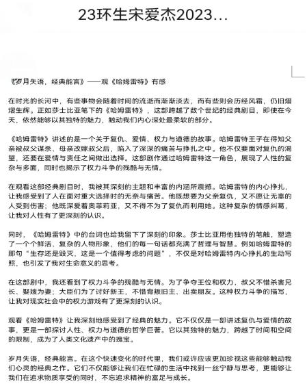 本次活动面对一区二区av全体同学开展,全院同学积极响应并且热情参与。同学们纷纷沉浸于经典的海洋,以独特的视角和深刻的感悟,书写下自己与经典作品相遇相知的心路历程。他们或引经据典,或旁征博引,用生动的语言和丰富的实例,展示了经典文学作品的独特魅力和深远影响,同时,也充分展现了同学们对经典作品的深刻理解和对知识的不懈追求,让同学们领略到了传统文化的博大精深,更让他们感受到了经典文化的独特韵味和时代价值。此次“岁月失语,经典能言”品经典有感活动的成功举办,不仅为同学们提供了一个深入了解和学习经典文化的平台,更为推动中华优秀传统文化的传承和发展注入了新的活力。