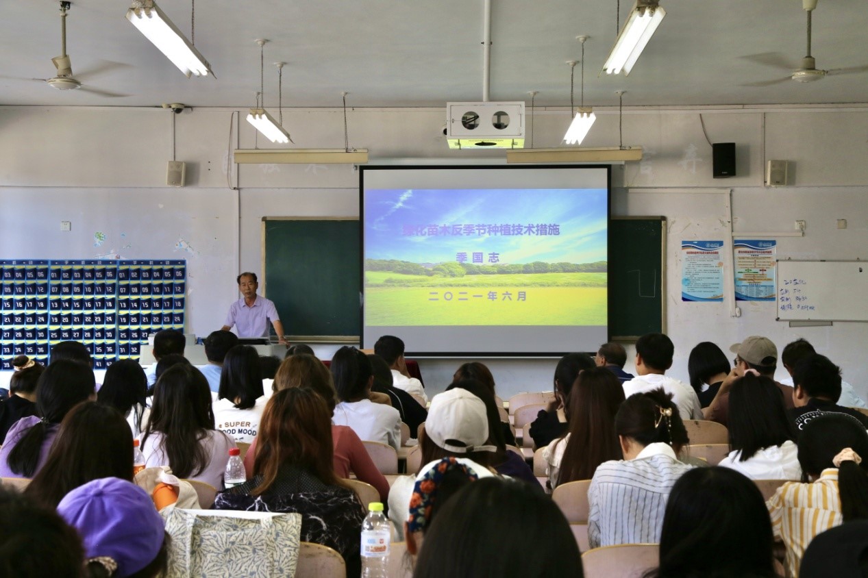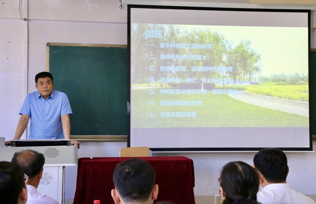 德州市园林绿化行业协会会长、山东绿科园林绿化工程有限公司总经理、高级园林工程师季国志做了《绿化苗木反季节种植技术措施》主题报告,介绍了绿化苗木行业反季节种植存在的问题,原因及应对措施,并分析了目前园林行业人才需求等。随后,原德州市园林处副主任、德州市盐碱土绿化研究所所长、高级园林工程师魏坤峰做了《中国园林发展新趋势》报告,结合个人工作经历介绍了优秀园林景观要素、中国园林发展趋势、大树移植的前沿技术、盐碱地绿化的新经验等,并对应用型人才培养提出指导建议。
