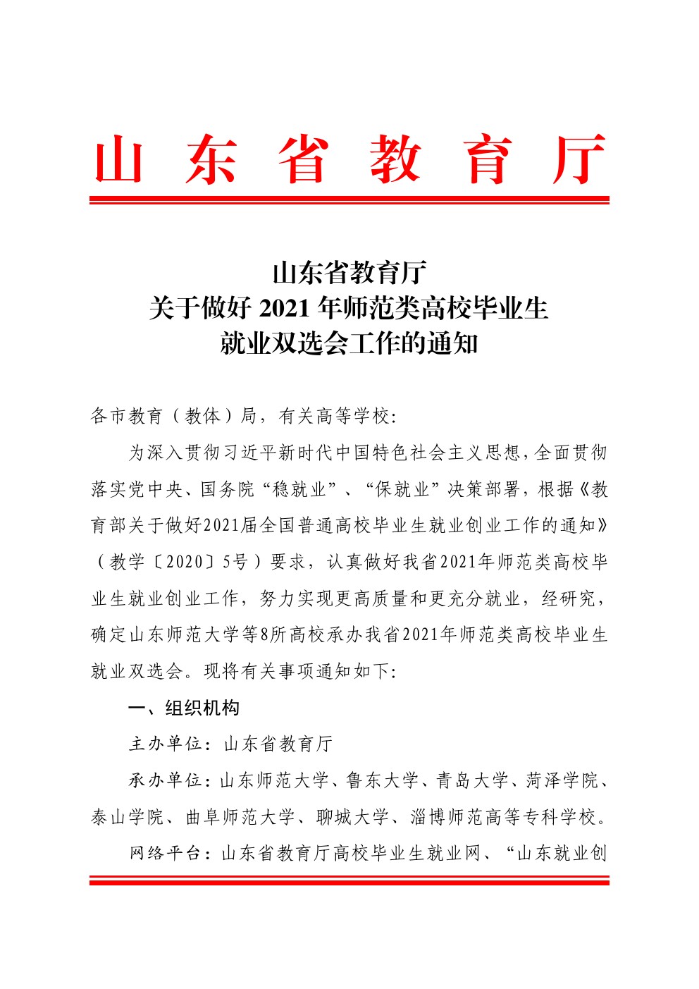 山东省教育厅关于做好2021年师范类高校毕业生就业双选会工作的通知