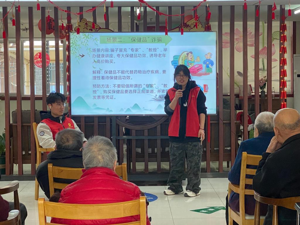 活动中,志愿者们将防诈宣传与代际关怀有机结合。在防诈宣传环节,针对常见诈骗类型,志愿者们自主编排了“冒充公检法”“保健品诈骗”“虚假专家夸大产品功效”等典型诈骗情景剧,并邀请福利院老人们参与角色扮演。通过剧情互动,引导老人们深入了解并拆解诈骗套路,有效提升识诈辨诈能力。每场情景演绎结束后,志愿者们结合实际案例,详细分析讲解防诈要点,并组织防诈经验交流会,以问答互动的形式加深老人们对诈骗手法的认识,进一步增强其防范意识。