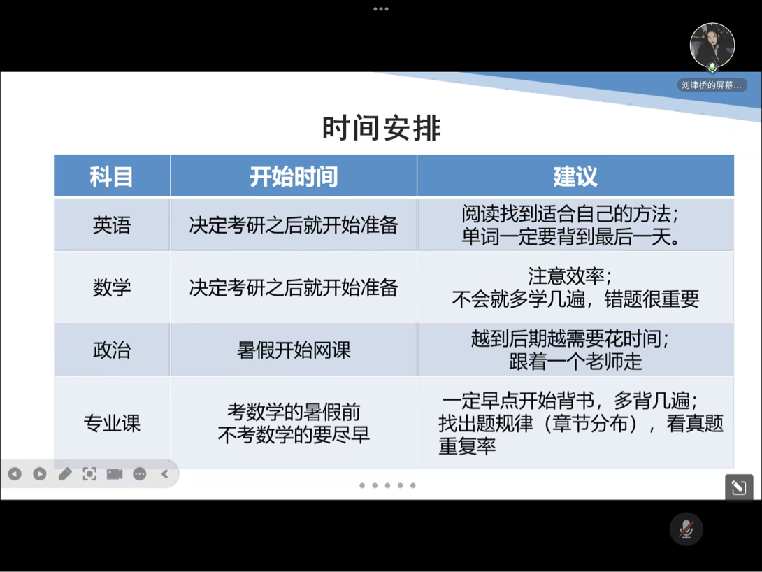 本次活动采用线上讲座的形式展开。我们有幸邀请了2019级地理科学专业的刘津桥同学分享她的备考经验。在讲座过程中,刘津桥同学就择校、备考时间安排、学习方法以及复试相关问答等环节进行讲解,并鼓励同学们以良好的心态备战考研。参会的同学们认真听取经验分享,积极参与问答环节,在交流中加深理解和认识,获得了及时的反馈和帮助。本场考研分享会在热烈而有序的气氛中落下帷幕,将考研经验分享给了每一位需要的考研学子,助力他们考研成功!