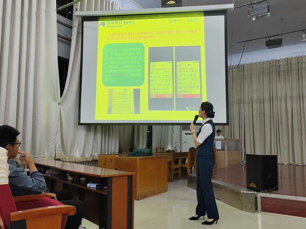 渤海银行主讲人从“什么是电信网络诈骗”、“网络诈骗识别公式”、“各类网络诈骗形式”、“预防和应对方式”以及“五大非法校园贷危害”深刻揭露电信网络诈骗及非法校园贷的特点和严重危害,为同学们上了一堂生动的防诈金融知识课。她强调网络贷款诈骗、刷单返利诈骗、杀猪盘诈骗等等诈骗行为凭借精巧的手段和伪装,诱骗同学们上当受骗,导致财产损失,进而导致身心健康受损,提醒同学们务必注意财产安全。同学们纷纷表示,以后会更加注意各类诈骗情形,尤其是网络诈骗,尽可能防止财产落入诈骗分子口袋中。