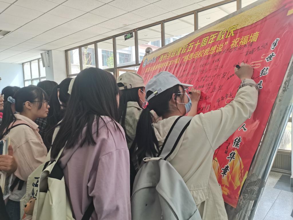 活动现场人头攒动,欢声笑语,同学们有的在轻声细语交流着想表达的祝福语,有的在祝福墙上奋笔疾书,“盛世迎华诞,明朝更璀璨”、“辛勤育人五十载,桃李天下迎华章”等一句句祝福语表达着学生们对学校最真切的祝愿。同学们用手中的笔、心中的情表达着自己心系母校、感恩母校的心情和对母校的美好祝愿。