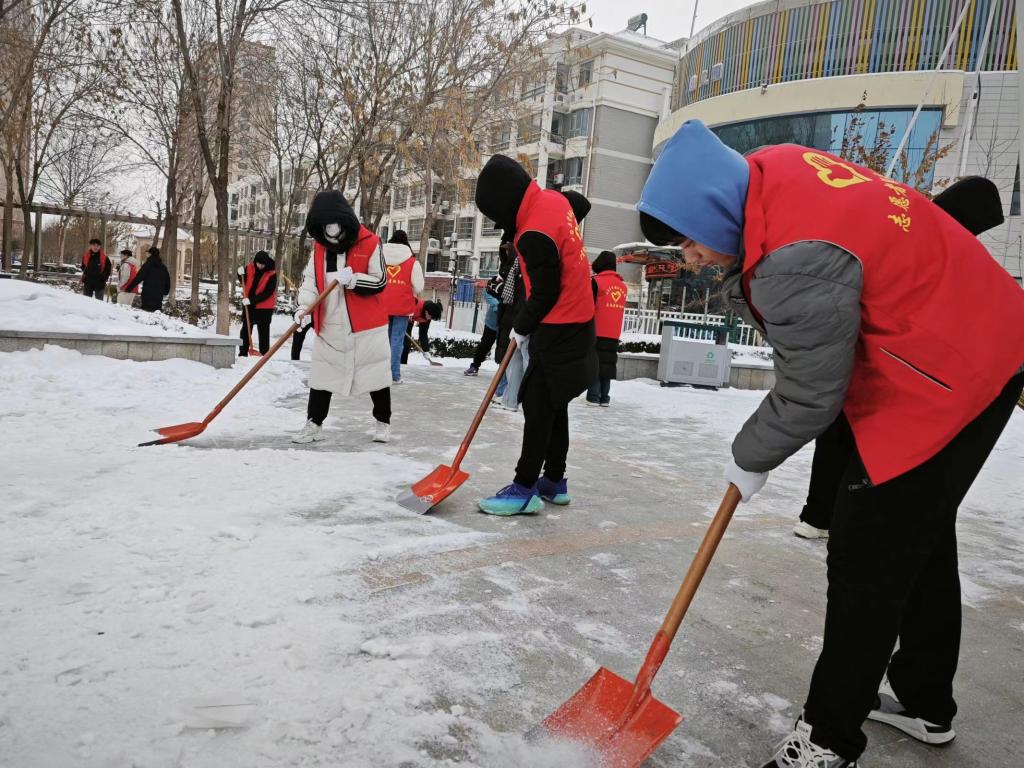 这次大雪来势汹汹,造成了社区道路堵塞,志愿者们迅速行动起来,组成多个小组,分别负责不同区域的除雪工作。活动伊始,志愿者们来到社区,分别对社区主要道路、居民楼周边开展了扫雪活动。志愿者们手持铁锹、推雪铲等工具,奋力清理道路上的积雪和冰块,大家齐心协力、配合默契,不畏严寒地全力投入到除雪工作中,彰显着学生志愿者的青春风采。在活动过程中,志愿者们还积极疏通下水道,确保融化后的雪水能够顺利流出,避免积水对居民生活造成不便。志愿者们还对道路两旁的树木、栏杆等积雪进行了清理,防止因积雪过多而发生意外。经过两个多小时的浴“雪”奋战,社区主要道路积雪基本清扫干净,志愿者们用自己的双手清出了一条“绿色通道”。