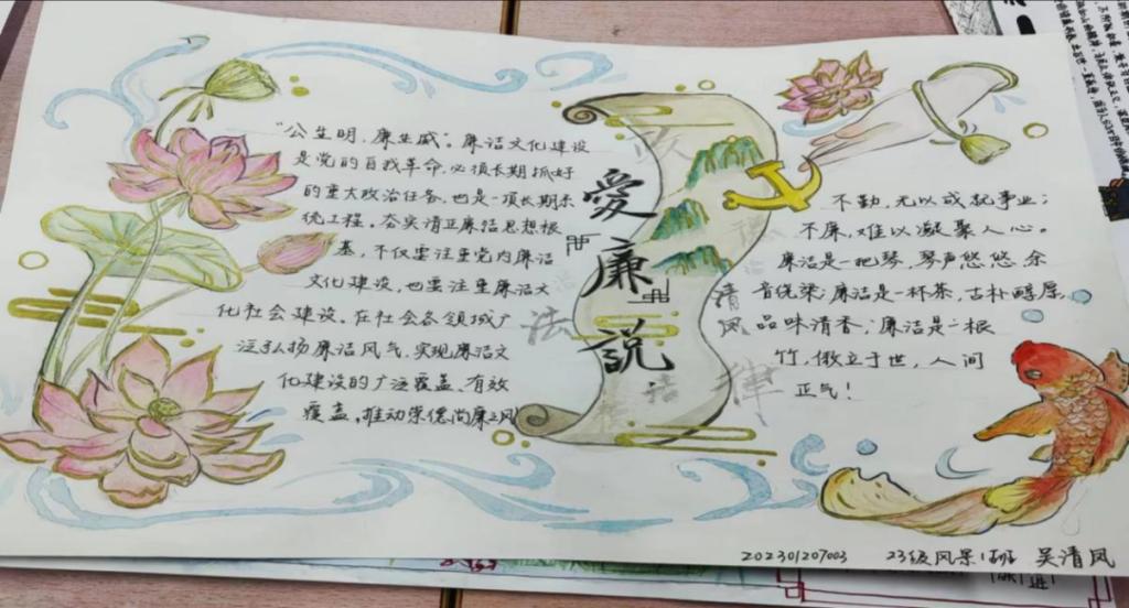 在此活动中,同学们深入学习新时代廉洁文化,不断加固廉洁教育的思想堤坝。通过所感所悟,将清正廉洁落笔于纸上,创造了多幅饱含廉洁深意的手抄报以及征文作品。出淤泥而不染的“莲”、充满廉洁之气的诗歌、发人深省的名言警句等,深刻诠释了同学们对廉洁的感悟。