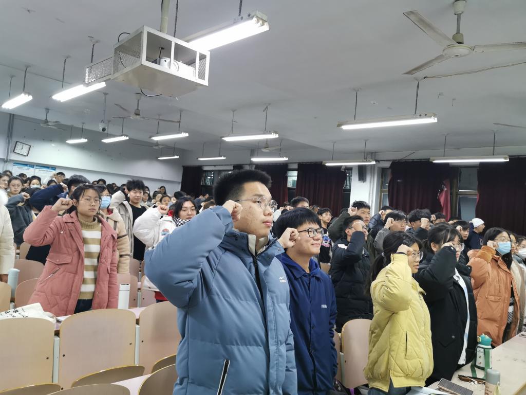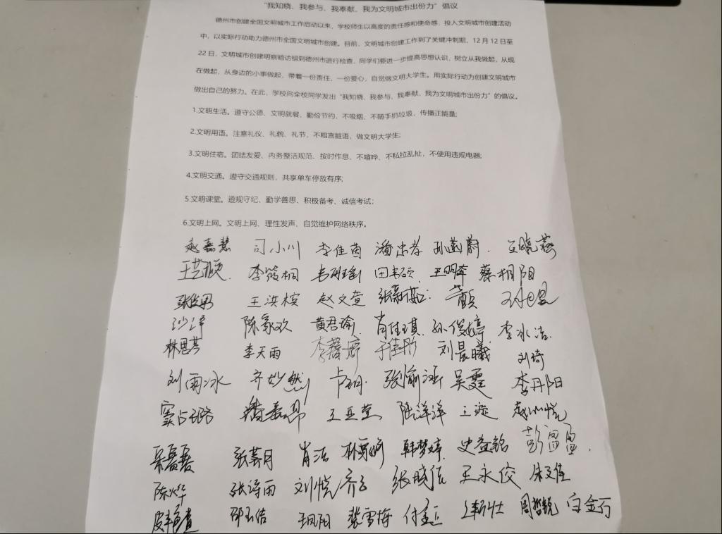 本次活动由我院学生会权益部举办,2021级全体学生共同参与,同学们集体学习了“我知晓、我参与、我奉献、我为文明城市出份力”倡议书中的重要内容,全面了解了大学生日常行为准则。会后,学生集体宣誓并签字,表达自己对创建城市的决心。