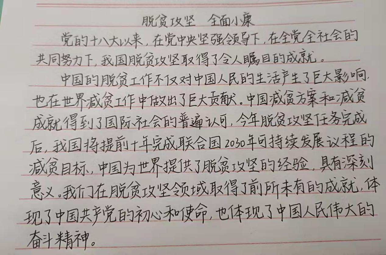 本次活动由学生会社团部主办,20级与21级全体同学参与了本次活动。活动主要围绕2020年打赢脱贫攻坚战的主题展开,以书写硬笔书法的形式共同见证脱贫攻坚的伟大事业。活动过程中,同学们积极参加,将自己对书法的热爱与祖国光荣事迹完美融合。